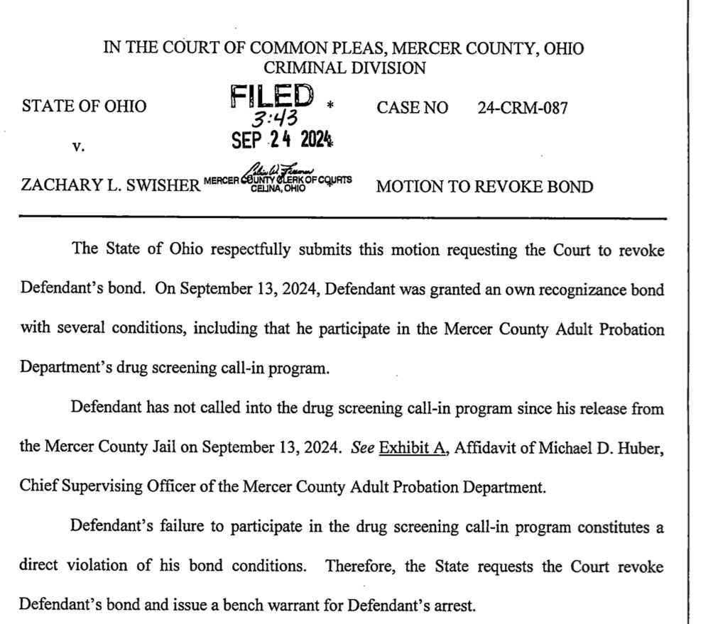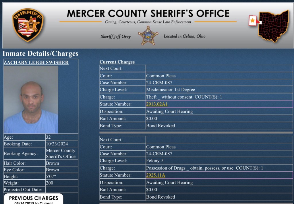 Zachary Swisher (32) Celina was charged with a 1st degree misdemeanor of theft without consent and a 5th degree felony of possession of drugs, obtain, possess or use. He was indicted on those charges in September.