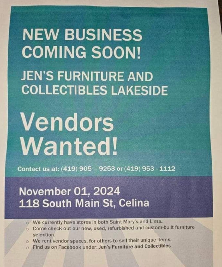 (10-23-24) A new business, Jen’s Furniture and Collectibles Lakeside, will be open in Celina on November 1st. This is their third location joining one in St. Marys and Lima.