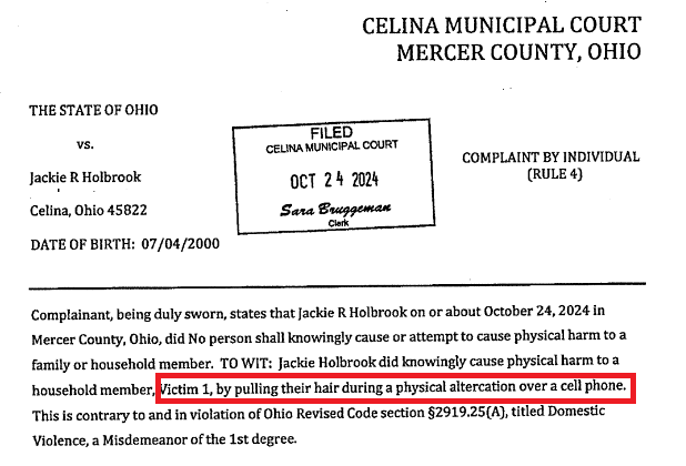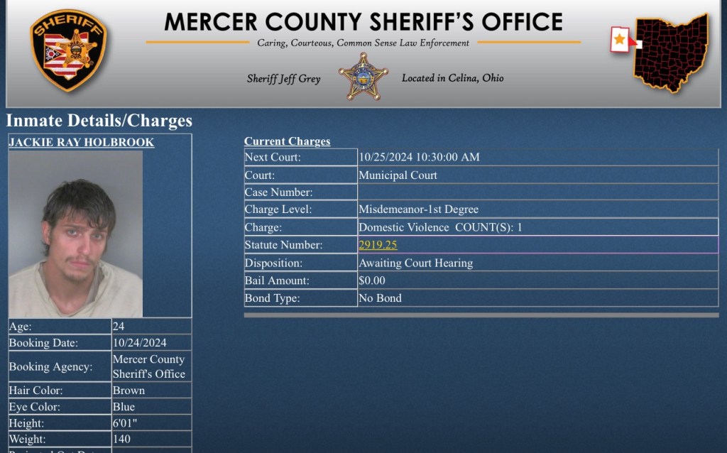(10-25-24) Jackie Holbrook (24) of Celina was booked yesterday on a 1st degree misdemanor charge of domestic violence.