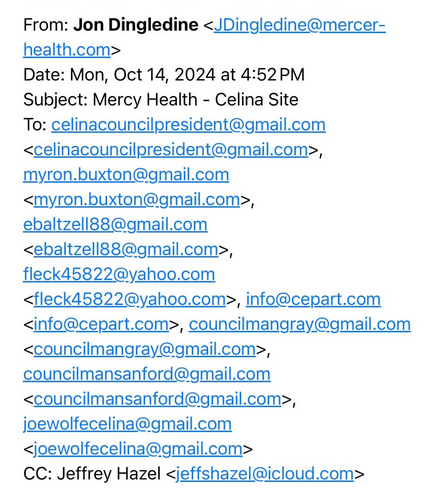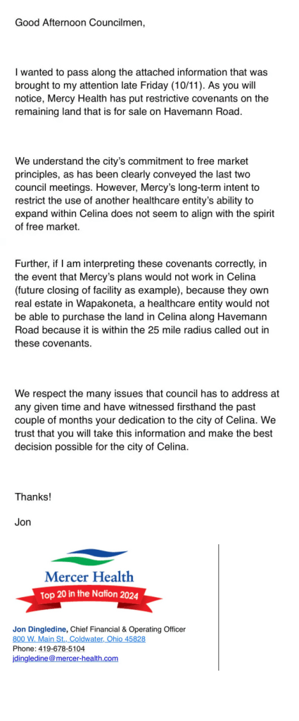 (10-30-24) Celina City Law Director George Moore has posted on his Facebook page the following on the recent denial of Celina City Council ordinance for the Mercy Health proposal. The email was sent from Mercer Health’s CFO Jon Dingledine to Celina Council Members and the Celina Mayor.