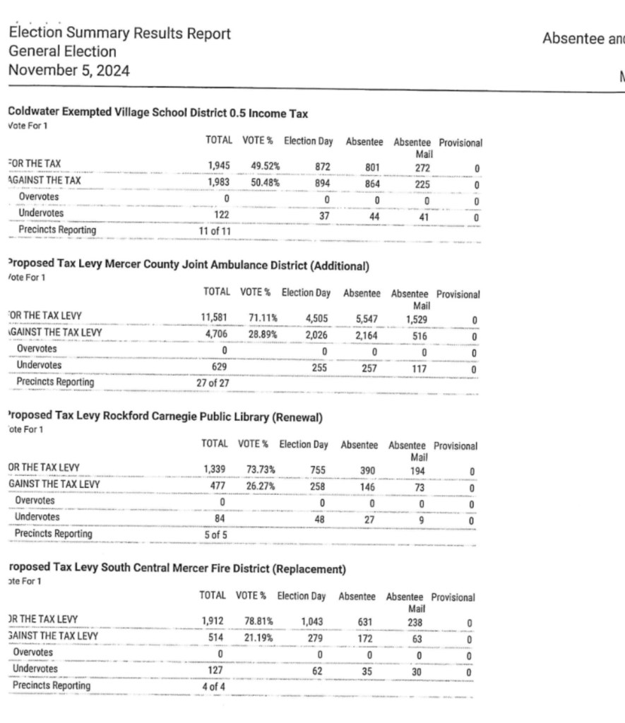 The tax levy for the Mercer County Joint Ambulance District passed with 71% of the vote.