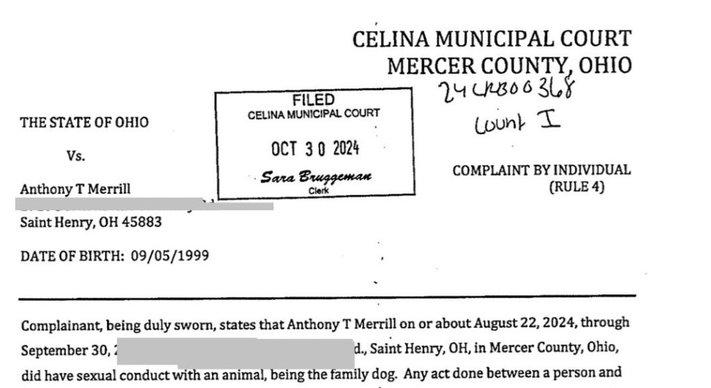 (11-8-24) Anthony Merrill (25) of Saint Henry has been charged with sexual conduct with an animal. The charge is a 2nd degree misdemeanor.