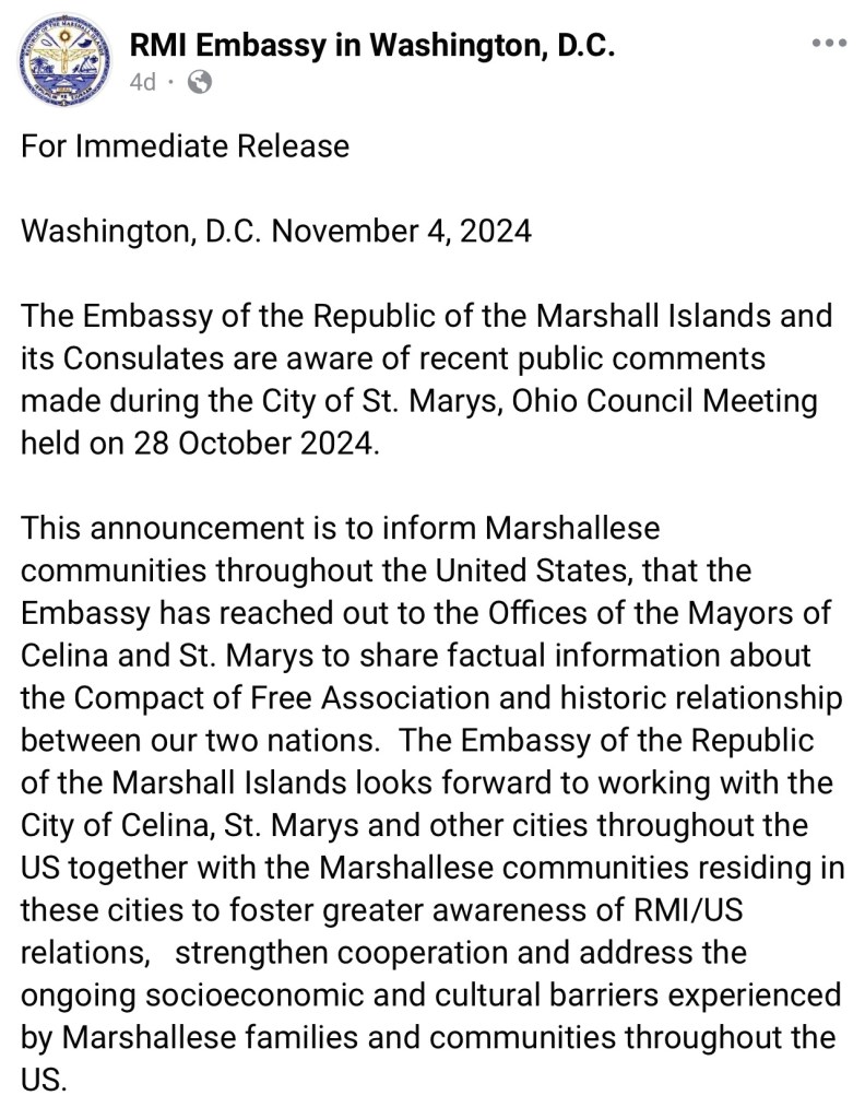 (11-9-24) Marshall Island Ambassador to Washington Charles Paul will be speaking to the public at the St. Marys City Council meeting on Monday, November 11th. The meeting will be inside the new St. Marys City Council chambers located at 101 West Spring Street.