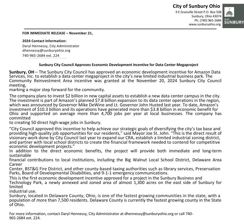 (11-23-24) Amazon Web Services (AWS) plans to build a $2 billion data center campus in Sunbury located in Central Ohio.