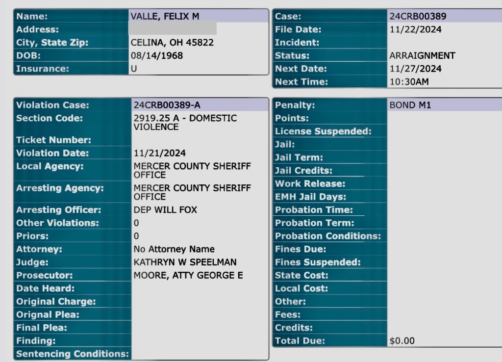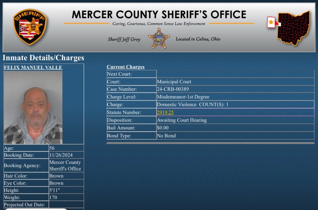 (11-27-24) Felix Valle (56) of Celina was arrested by the Mercer County Sheriff’s Office on a 1st degree misdemeanor charge of domestic violence charge.