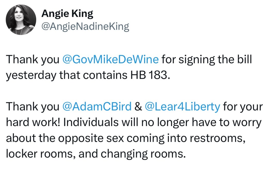 (11-27-25) Governor Mike DeWine signed Senate Bill 104 into law on Wednesday. The bill amends the Protect All Students Act, which requires public and private schools, colleges and universities to designate separate bathrooms, locker rooms, and overnight accommodations “for the exclusive use” of either males and females, based on one’s gender assigned at or near birth, in school buildings and other facilities used for school-sponsored events. It contains no enforcement mechanism.