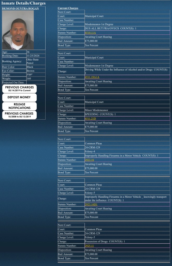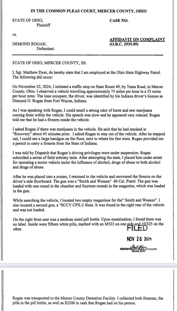 (11-26-24) Demond Rogan (36) of Ft. Wayne was arrested after a traffic stop on SR 49 by an Ohio State Highway Patrol Officer.