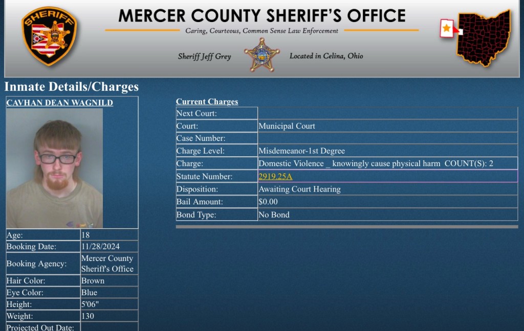 (11-28-24) Celina teen Cavhan Wagnild (18) was arrested today by the Mercer County Sheriff’s Department on a 1st degree misdemeanor charge of domestic violence.