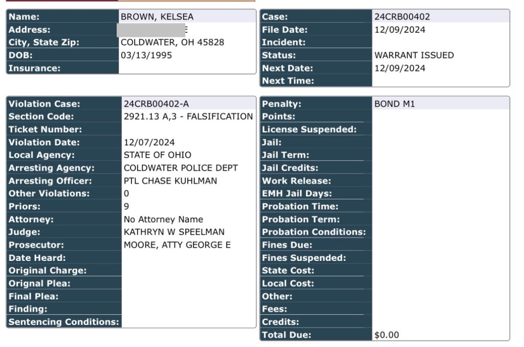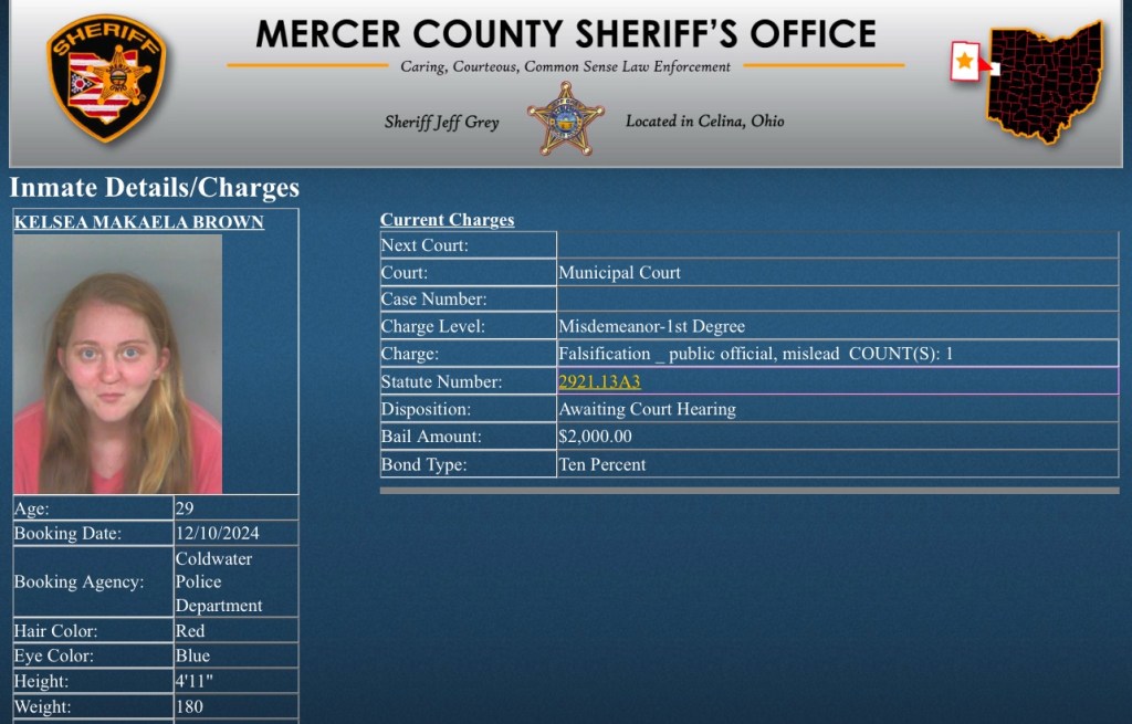 (12-10-24) Kelsea Brown (29) of Coldwater was arrested by the Coldwater Police on a 1st degree misdemeanor charge of Falsification, public official,misled.