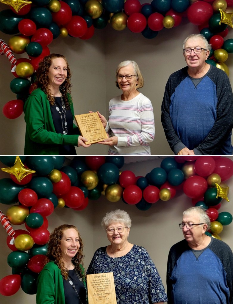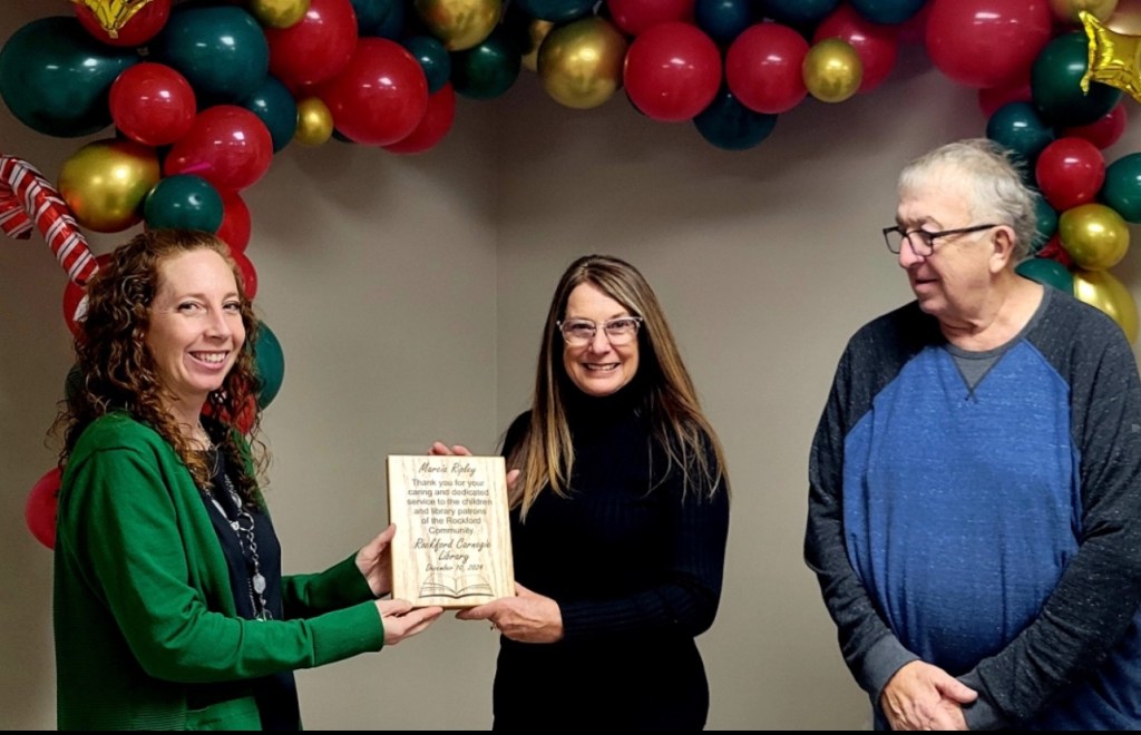 (12-12-24) After 65+ years of combined years of dedicated service, Library Board of Trustees members Georgie Wilson, Marcia Ripley and Marge Gehle retired from the Rockford Carnegie Library Board of Trustees.