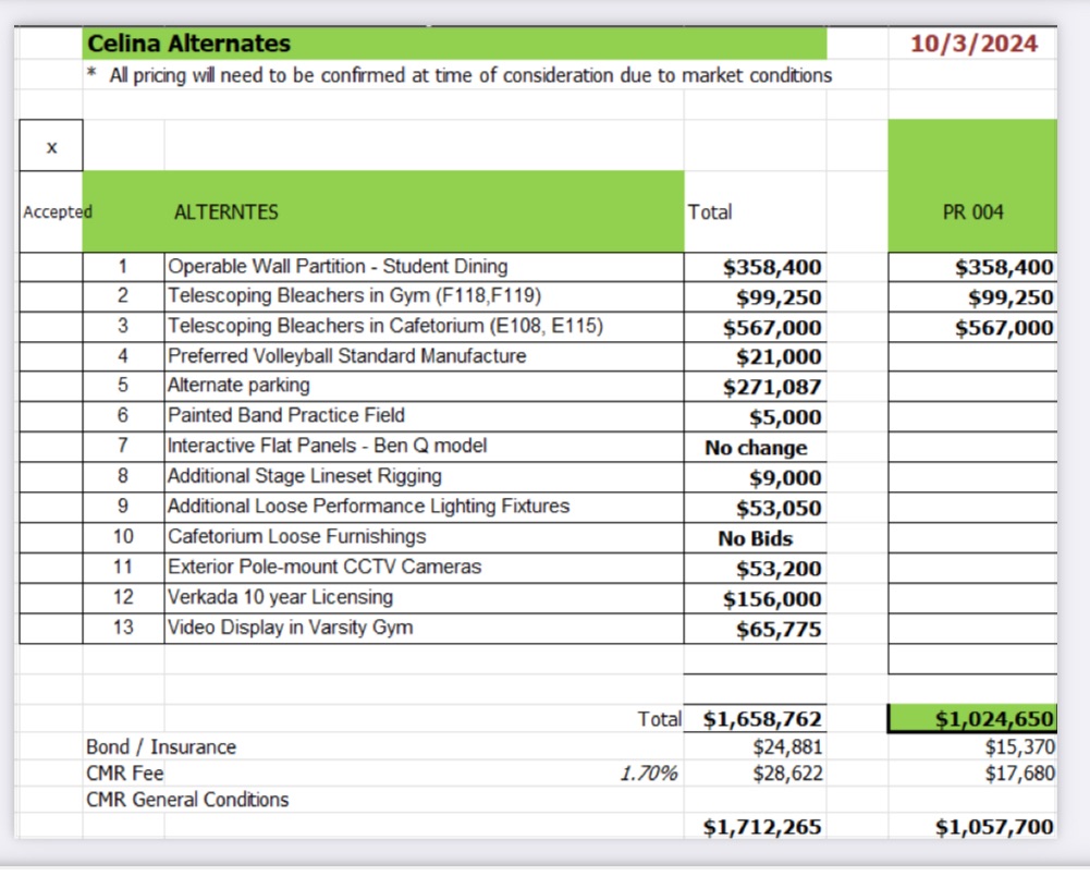The estimate is from Peterson Construction and includes two alternates of telescoping bleachers.