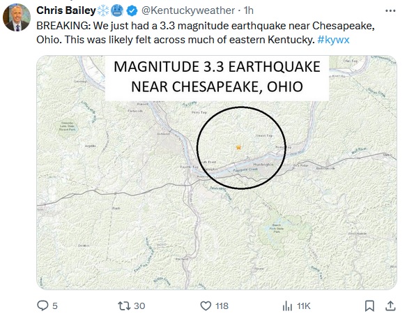 (12-16-24) A magnitude 3.3 earthquake was reported today near the Chesapeake, Ohio area and was felt as far as Kentucky and West Virginia.