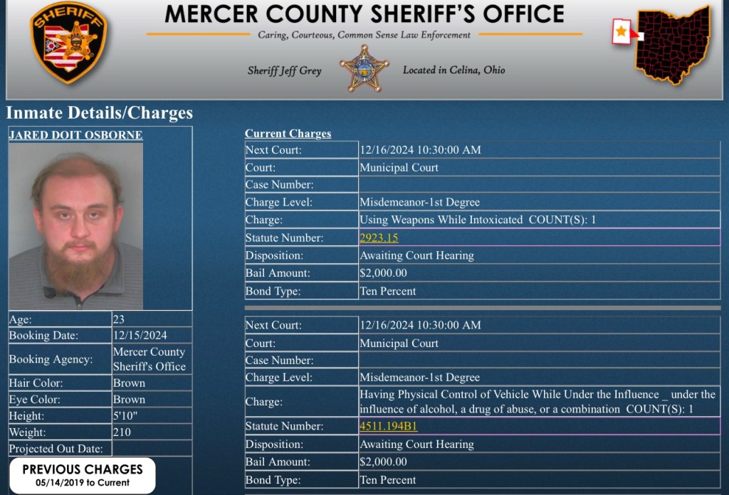(12-16-24) Jared Osborne (23) of Celina was arrested ona 1st degree misdemeanor misdemeanor charge of using weapons while intoxicated and a 1st degree misdemeanor of having physical control of vehicle while under the influence.