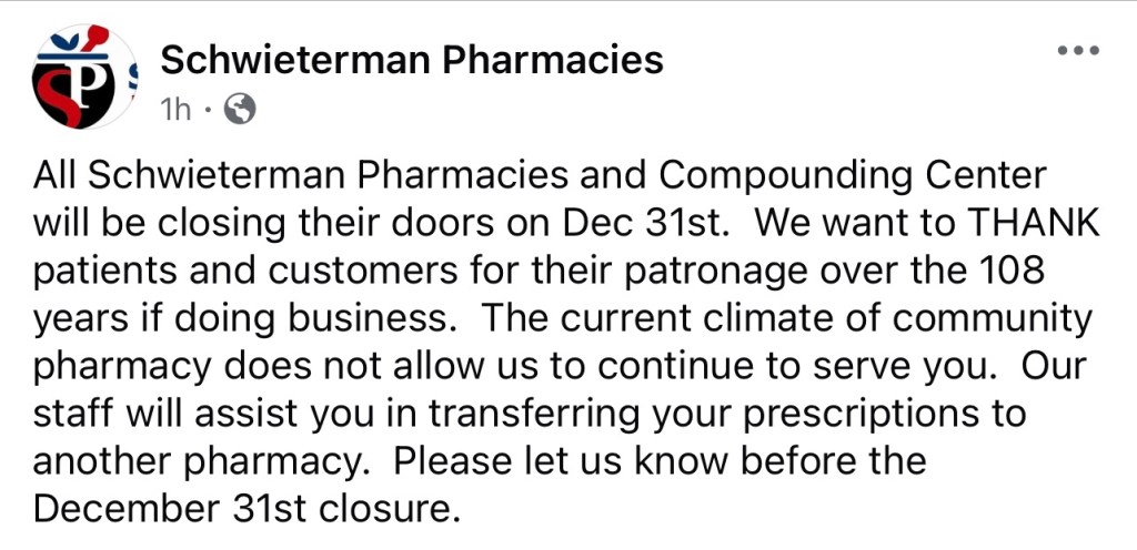 (12-17-24) Locally owned Schwieterman Pharmacies announced today that they are closing all three of their locations in Coldwater, Minster and New Bremen.