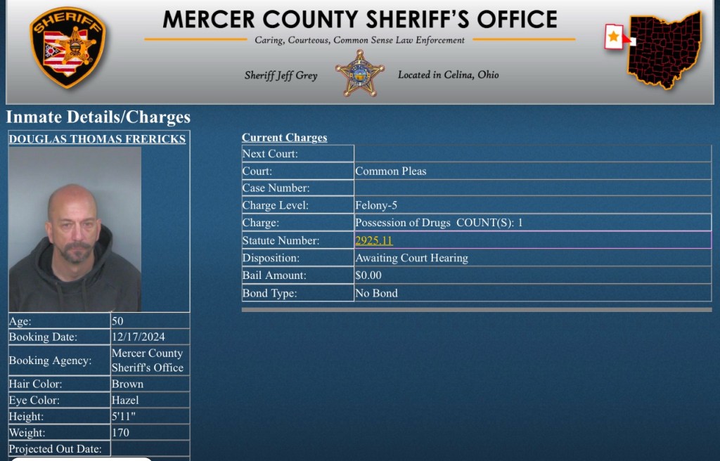 (12-17-24) Douglas Frericks (50) of Wapakoneta was arrested today by the Mercer County Sheriff’s Department on a 5th degree felony of drug possession.