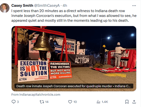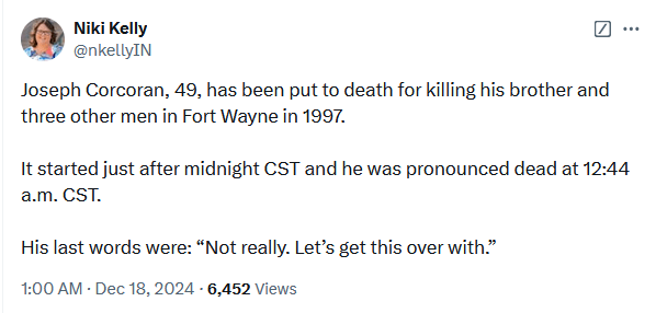 (12-18-24) Convicted murderer Joseph Corcoran (49) of Ft. Wayne was pronounced dead by lethal injection at 12:44 a.m. Wednesday morning at the Indiana State Prison, marking the first Indiana execution since 2009.
