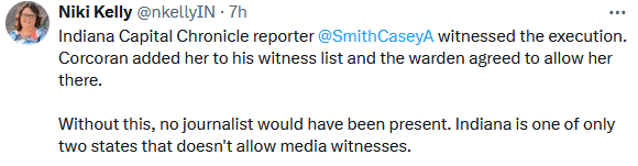 “Joseph Corcoran’s case has been reviewed repeatedly over the last 25 years – including 7 times by the Indiana Supreme Court and 3 times by the U.S. Supreme Court, the most recent of which was tonight. His sentence has never been overturned and was carried out as ordered by the court.”