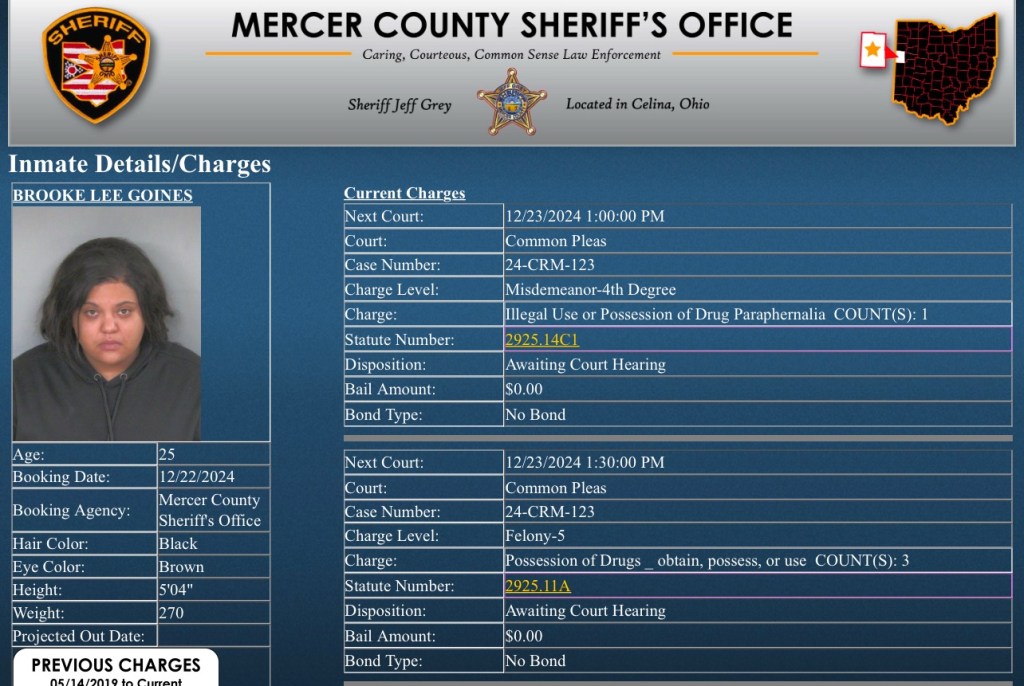(12-22-24) Today Brooke Goines (25) of St. Henry was booked into the Mercer County Adult Detention Center on a 3rd degree felony of possession of drugs, obtain, possess or use and a 4th degree misdemeanor of illegal use or possession of drug paraphernalia.