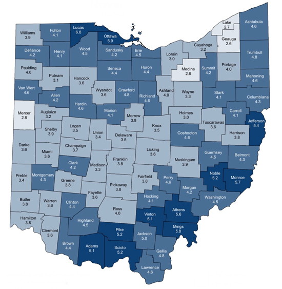 For the first time in several months Mercer County did not have the state’s lowest rate – 2.8%. The three lowest rates went to Medina and Geauga Counties at 2.6% and Lake County was at 2.7 %.