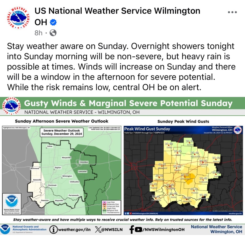 (12-28-24) High wind gusts and rain are expected for the area tonight and tomorrow and could include some severe weather.