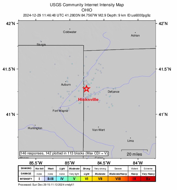 (12-29-24) According to the United States Geological Survey (USGS), a 2.9 mb_L earthquake was felt in Hicksville and other parts of northwest Ohio and Northeast Indiana. The map on USGS shows waves have been felt as far as southwest Fort Wayne.