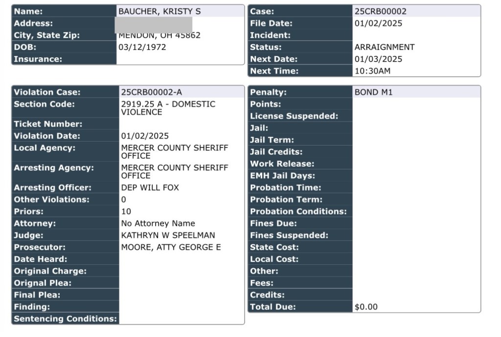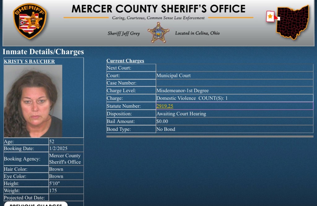 (1-2-25) Kristy Baucher (52) was arrested today by the Mercer County Sheriff’s Office on a 1st degree misdemeanor domestic violence charge.