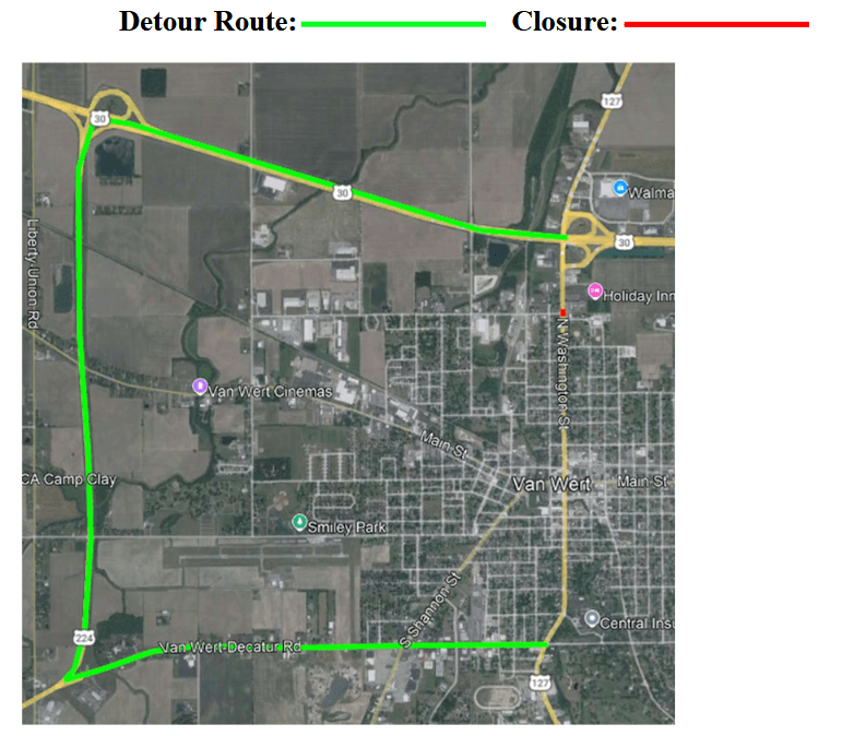 (1-2-25) VAN WERT COUNTY: TRAFFIC ADVISORY U.S 127/Washington St north bound at Bonnewitz Ave in the city of Van Wert will close on Monday January 13th, for approximately 7 days for the Bonnewitz Ave extension project. The south bound left turn lane will also be closed.