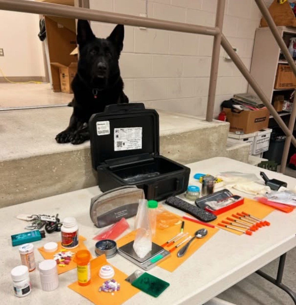 A Darke County Sheriff’s Office K-9 was deployed to conduct a free air sniff of the vehicle which rendered a positive alert. A search of the truck was conducted where Deputies located a substantial amount of suspected methamphetamine and various other pills.
