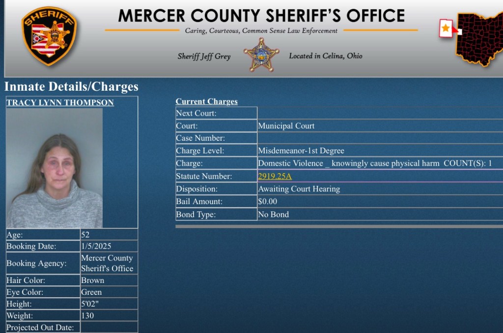 (1-6-25) Tracy Thompson (52) of Maria Stein was arrested yesterday on a 1st degree misdemeanor domestic violence charge.