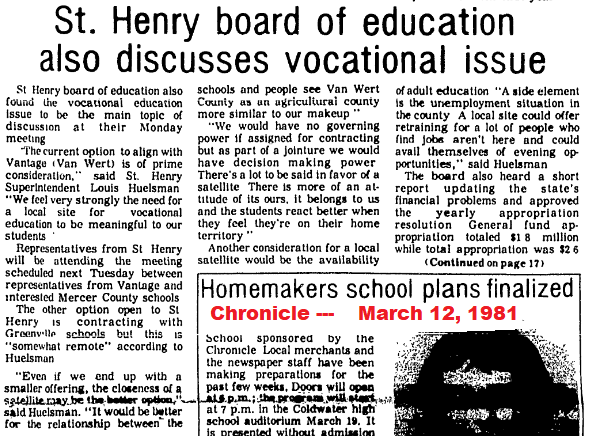 Ohio school districts were required to provide vocational education fot their Junior and Senior students. Mercer and Auglaize County schools were given the opportunity to join already established districts. This included both Vantage and Apollo…but after several election failed to get the support to be assisned to those districts. That is when the talk of vocational education started to have a plan that would be in the local area.