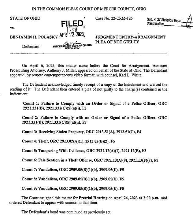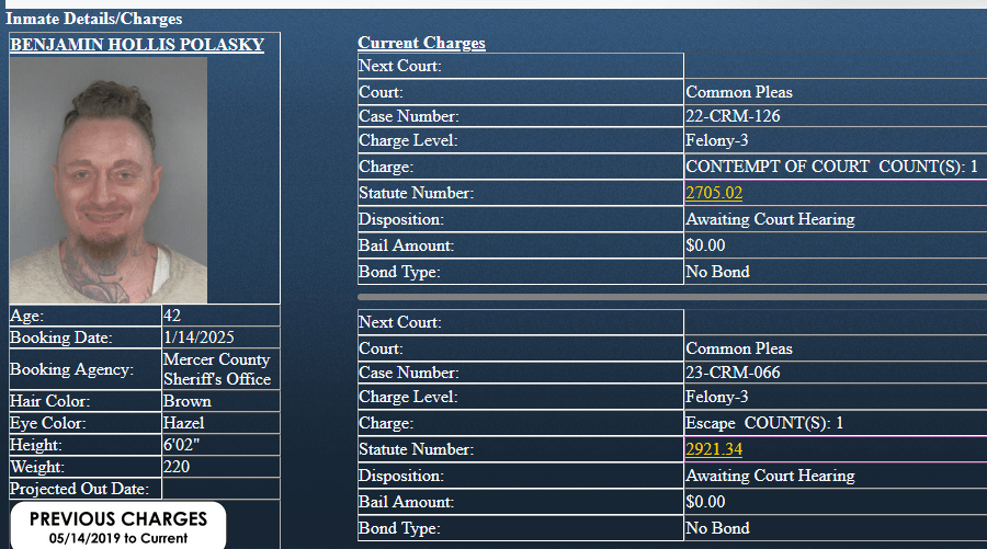 Polasky, besides numerous felony indictment charges from 2022, is now in the Mercer County Adult Detention Center on two more felony charges of contempt of court and escape. He is awaiting a hearing in the Mercer County Common Pleas Court hearing
