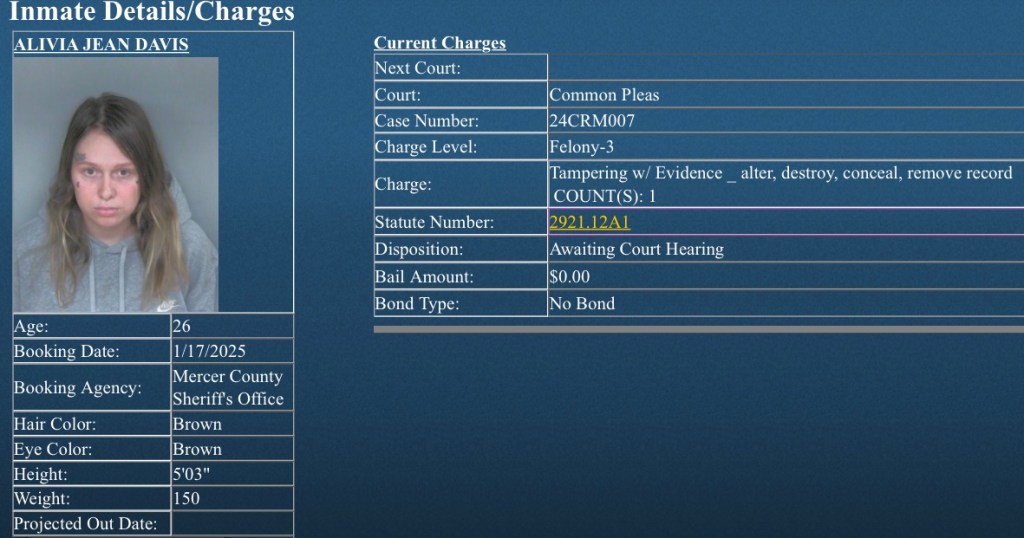 (1-18-25) Alivia Davis (26) of Celina was arrested yesterday on a 3rd degree felony charge of tampering with evidence…alter, destroy, conceal, remove record.