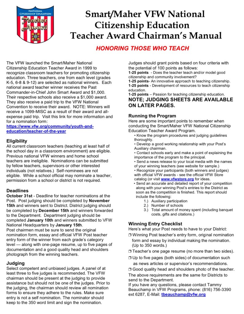 (1-22-25) Each year, the Veterans of Foreign Wars selects elementary, middle, and high school teachers to participate in the Smart/Maher VFW National Citizenship Education Teacher program.