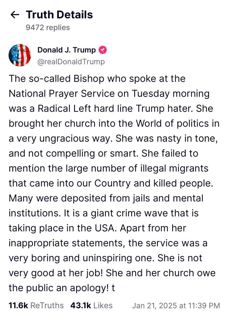 (1-22-25) The National Prayer Service yesterday in the National Cathedral in Washington DC was not what President Trump expected.