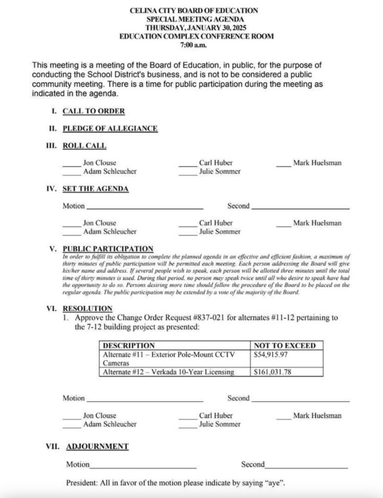 (1-28-25) Notice is hereby given that there will be a special meeting of the Celina City Board of Education, Mercer County, Ohio, on Thursday, January 30, 2025 at 7:00 am in the conference room at Celina City Schools Education Complex building at 585 E. Livingston Street in Celina.