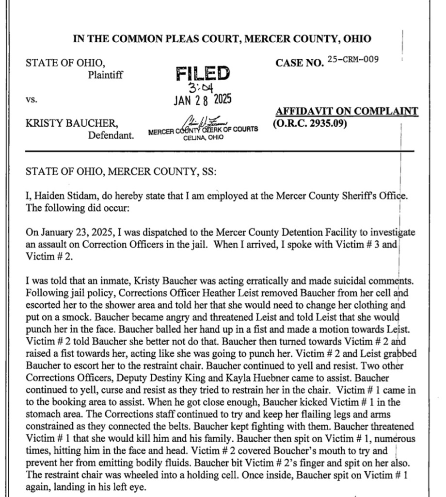 (1-29-25) Kristy Baucher (52) of Celina faces felony charge of assault (5th degree) and harrassment with a bodily substance (5th degree) for her conduct with Mercer County Adult Detention Facility officers when she was being booked for DUI on Thursday January 23rd.
