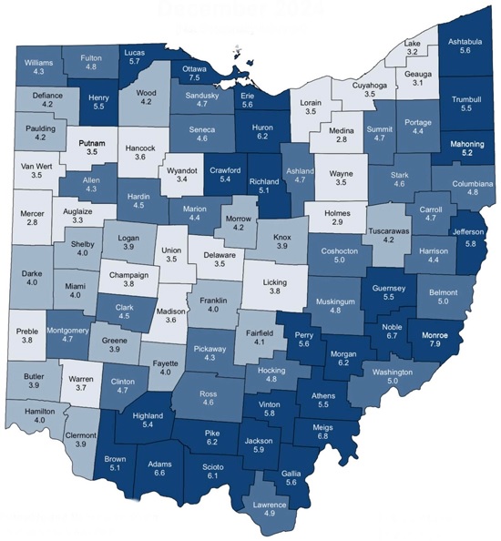 (1-29-25) Ohio’s Unemployment Rate increased to 4.4% in Decembr, 2024, up from 4.3% in November 2024. Ohio’s nonagricultural wage and salary employment increased 6,800 over the month, from a revised 5,684,700 in November to 5,691,500 in December.