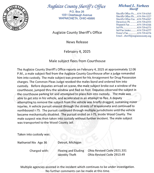 (2-4-25) Two people allegedly fled the Auglaize County Courthouse in Wapakoneta today and were later arrested in Wood County after leading area law enforcement agencies on a high-speed chase that passed through four counties.