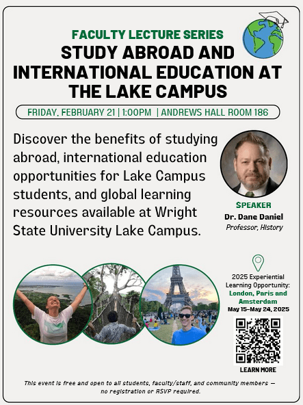 Join Dr. Dane Daniel, Professor of History and discover the benefits of studying abroad, international education opportunities for Lake Campus students, and global learning resources available at Wright State University–Lake Campus.