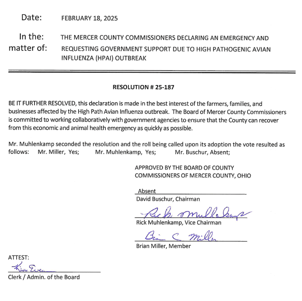“The Mercer County Commissioner passed an Emergency Declaration yesterday to support our poultry community dealing with the ongoing Highly Pathogenic Avian Influenza. We are committed to working with and supporting the agricultural community during this crisis; this involves collaborating with agricultural experts, veterinarians, and other government agencies to ensure best practices and to utilize available resources.”