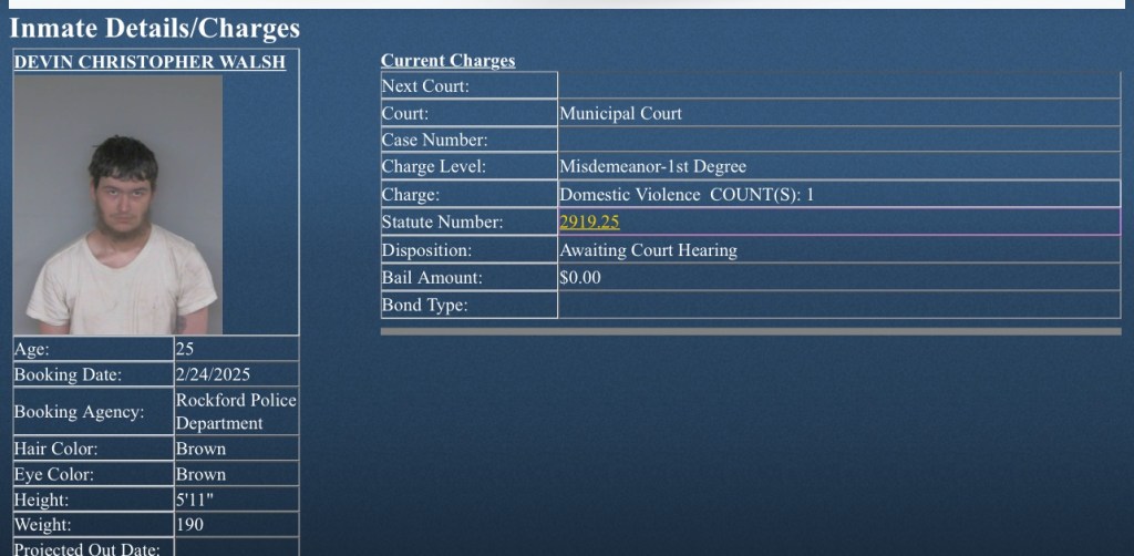 (2-24-25) Rockford Police arrested Devin Walsh (25) of Ohio City today on a 1st degree misdemeanor of domestic violence.