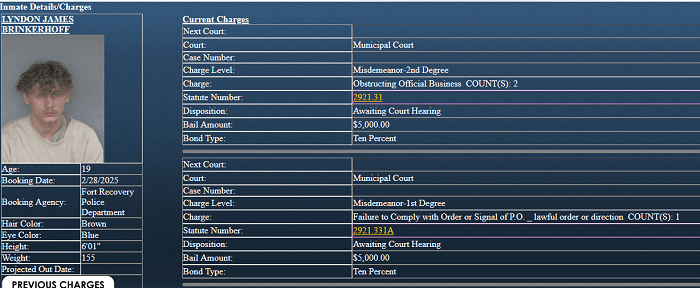 On 02/28/2025, Brinkerhoff was located at his residence after Law Enforcement was informed of his location. Law Enforcement from Fort Recovery, Coldwater Police Department and the Mercer County Sheriff’s Office were able to apprehend him at this time. He was transported by Fort Recovery Police Department to the Mercer County Adult Detention Center and incarcerated on one charge of resisting arrest and two charges of Obstructing Official Business.