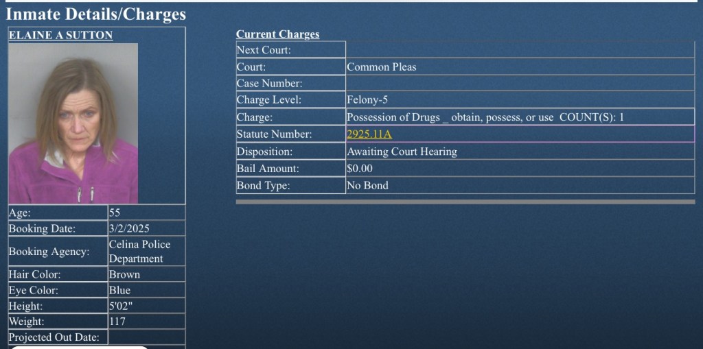 (3-2-25) Celina Police today arrested Elaine Sutton (55) on a 5th degree felony charge of possession of drugs, obtain, possess or use.