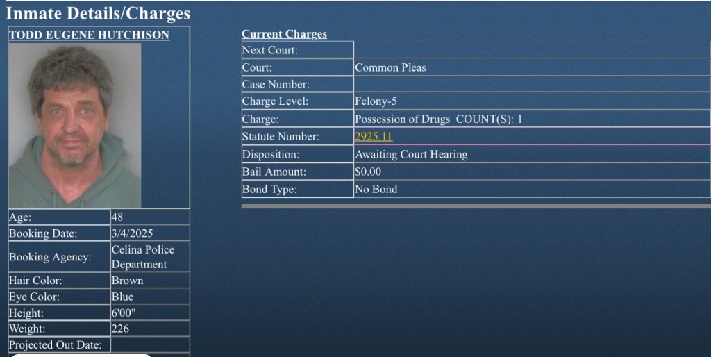 November 15, 2024 – Hutchison was booked in ALLEN COUNTY, OHIO FOR HAVING WEAPONS WHILE UNDER DISABILITY.