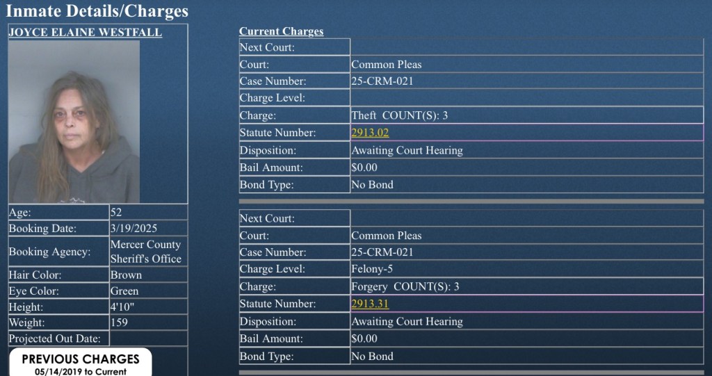 (3-19-25) Joyce Westfall (52) was booked by the Mercer County Sheriff’s Office on 3 counts of theft and one felony count of forgery.