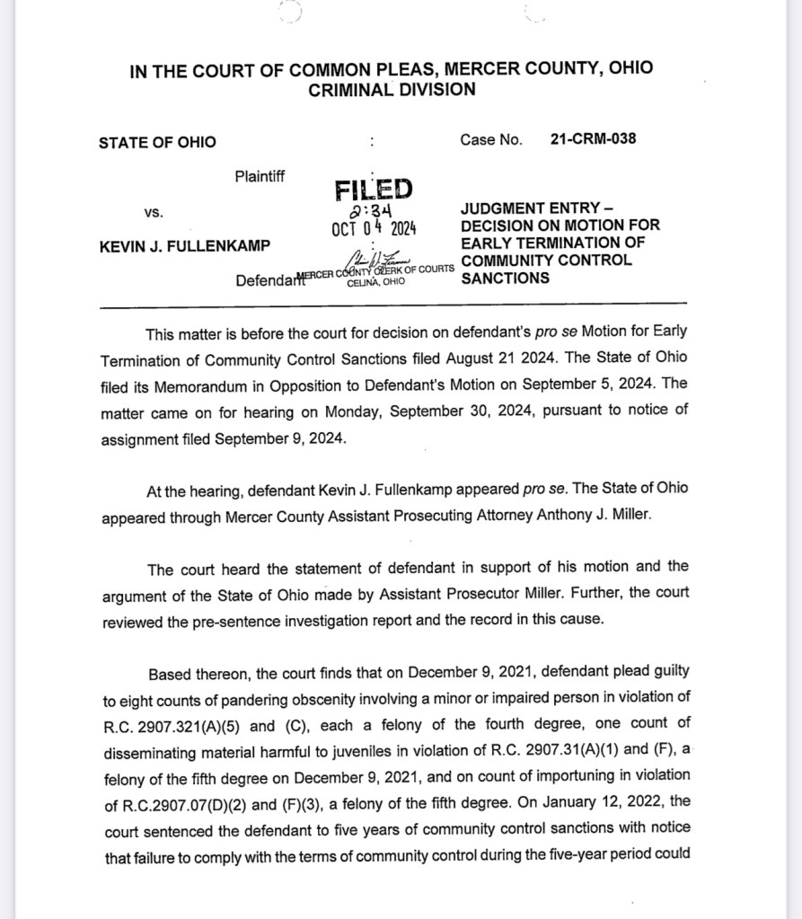 Kevin Fullenkamp (64) of St. Henry was booked on a 3rd degree felony of soliciting and a 2nd degree felony of pandering sexually oriented material involving a minor.