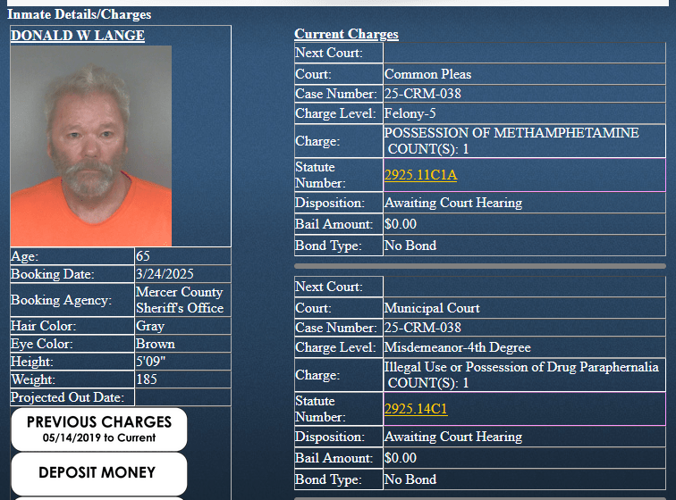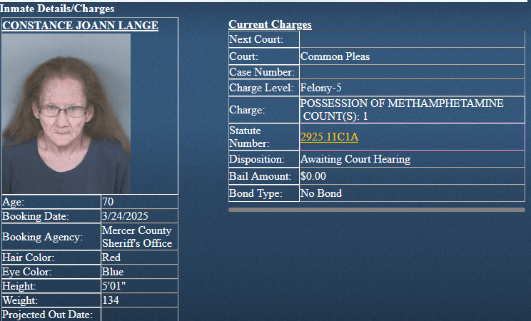 (3-25-25) Two Celina residents, Constance Lange (70) and Donald Lange (65) were both arrested by the Mercer County Sheriff’s Office on 5th degree felony charge of Possession Of Methamphetamine charge. Donald was also booked on a 4th degree misdemeanor of illegal use or possession of drug paraphernalia.