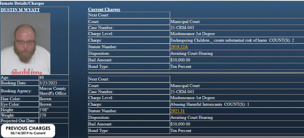 (3-26-25) Two were booked yesterday by the Mercer County Sheriff’s Office, Megan Wyatt (30) was arrested on a 3rd degree felony endangering children, create substantial risk of harm and and a 1st degree misdemeanor of abusing harmful intoxicants.