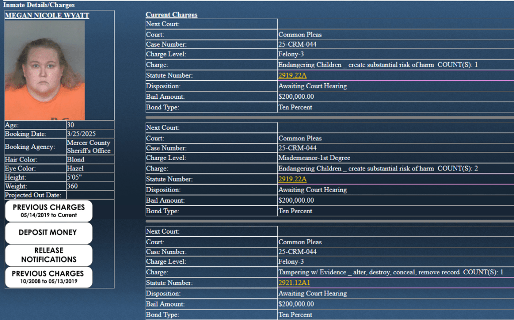 Megan is being held on $200, 000 (10%) bond and Wyatt at $50,000 (10%) bond at the Mercer County Adult Detention Center.
