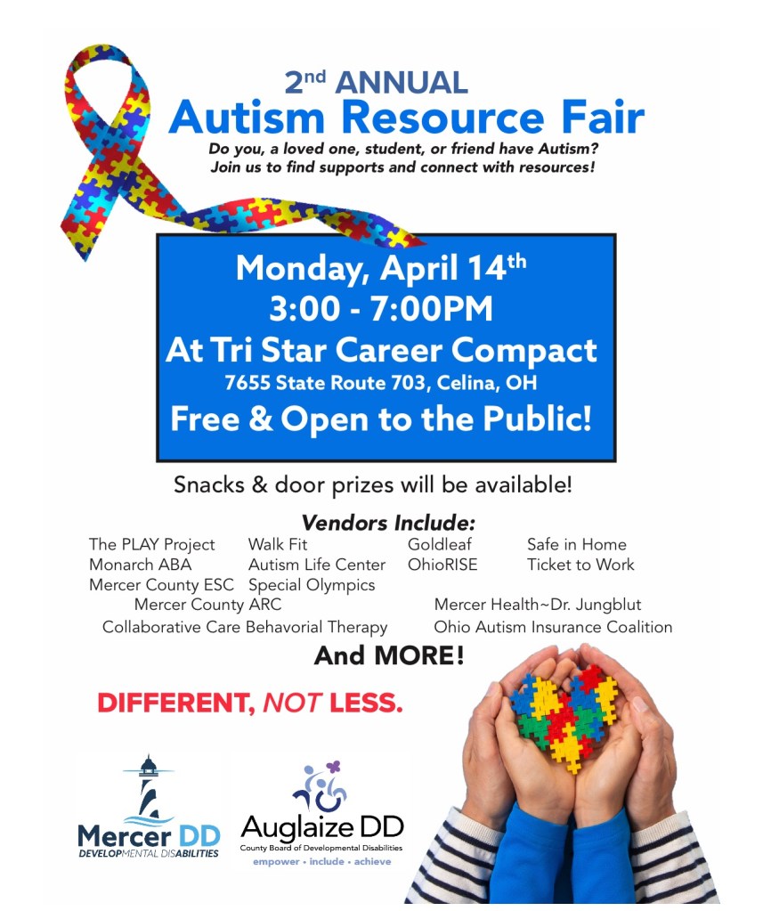 CELINA, Ohio (3-27-25)— The Mercer County Board of Developmental Disabilities (Mercer DD) is partnering with Auglaize DD to host an Autism Resource Fair on Monday, April 14th, from 3:00-7:00 PM at the Tri Star Career Center in Celina.
